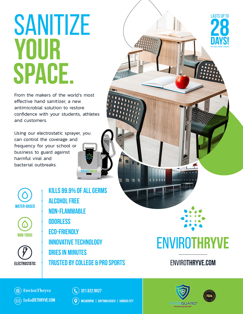 The current times have called for us all to do our part in the war against germs and bacteria. Legacy Sports Construction has partnered with EnviroThryve to bring you Invisiguard. We are offering a patented disinfectant spray that Kills 99.9 percent of all germs and bacteria with technology rather than chemicals. Our water-based disinfectant will kill germs while not harming our environment and keeping your equipment in optimal shape, and your athletes chemical free. We will disinfect every square inch with an electrostatic sprayer.